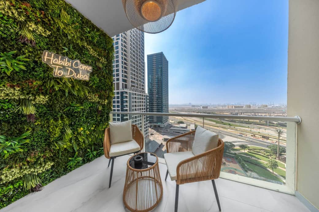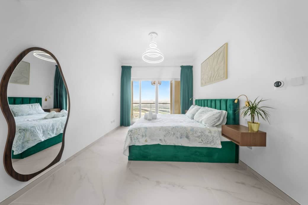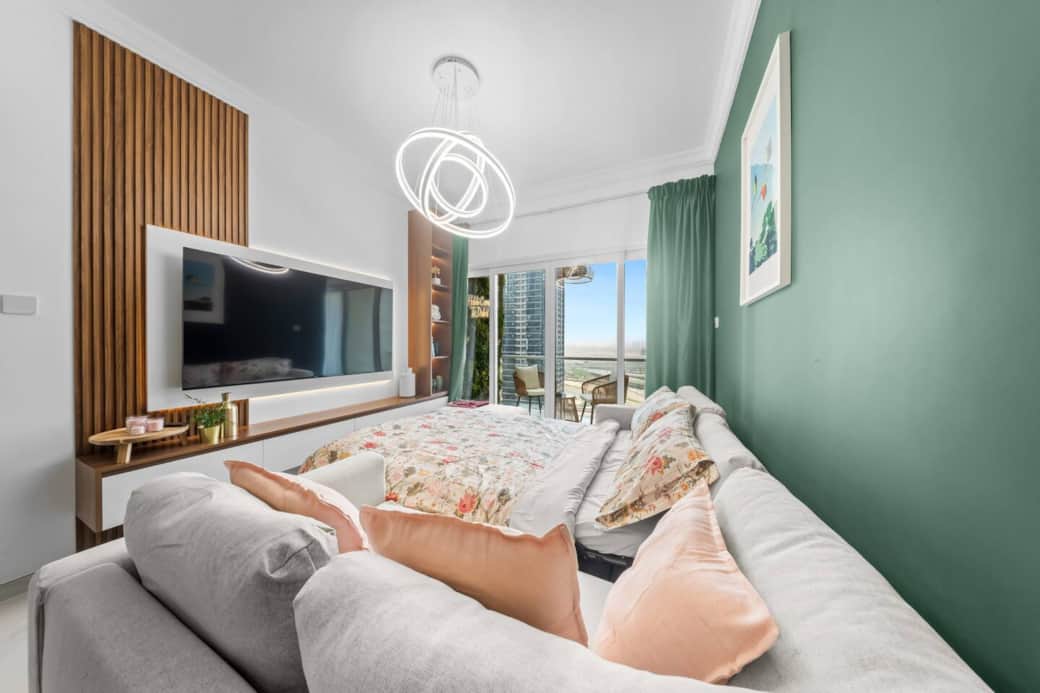 Situé au cœur de JLT, ce charmant appartement d'une chambre, récemment rénové, arbore d'élégantes touches de vert émeraude et d'or. Il comprend une cuisine équipée, un salon TV confortable, une chambre élégante, une salle de bains et des toilettes.